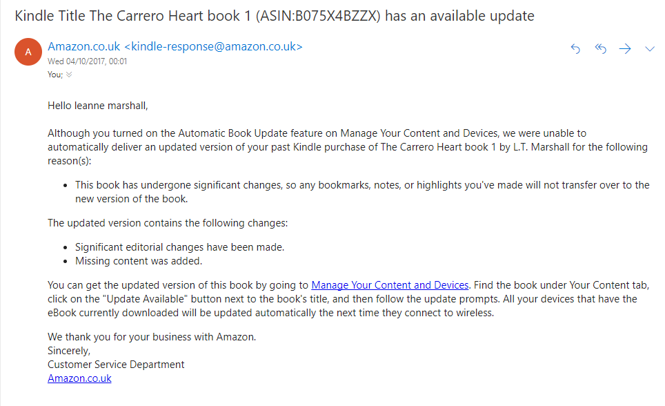 So anyone who got the original download on amazon can now update their kindles for the proper version. You will have received an email with instruction on how to do so. Manually go to the book in your contents page and click on the accept update button.