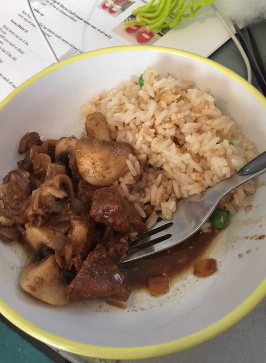 I took out the pork and sliced up into bite size chunks and left in a bowl. I poured the onion and left over sauce in a jug with 100ml boiling water, one chicken stock cube, 1 tsp soy sauce and left it aside.