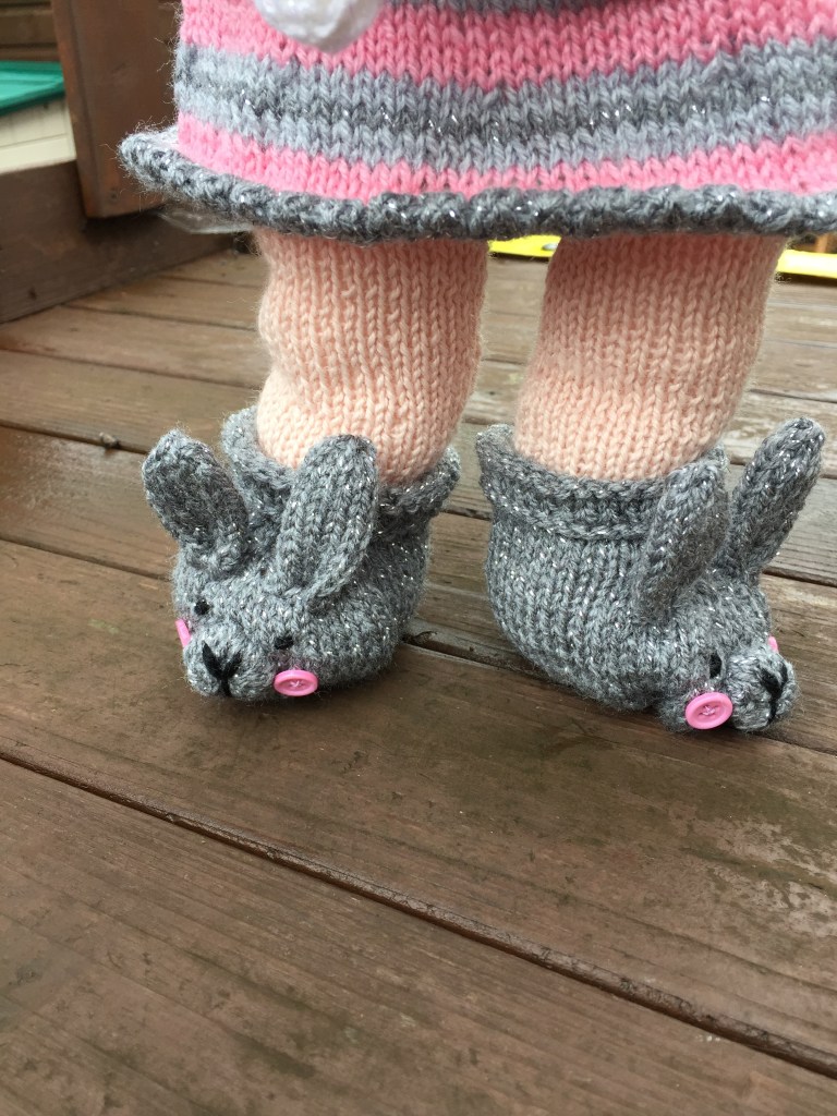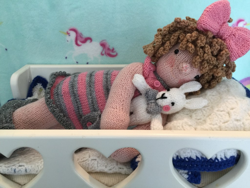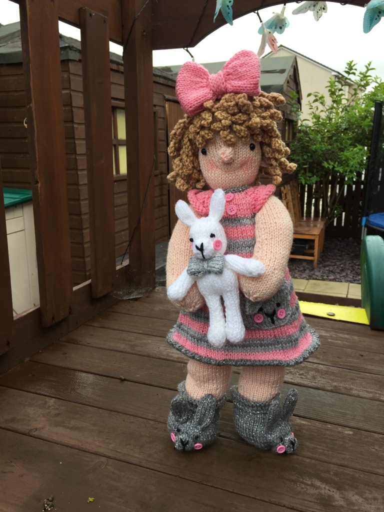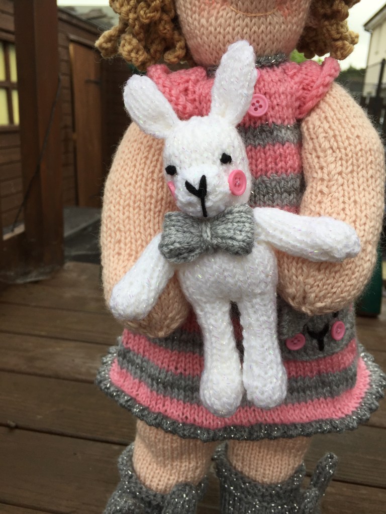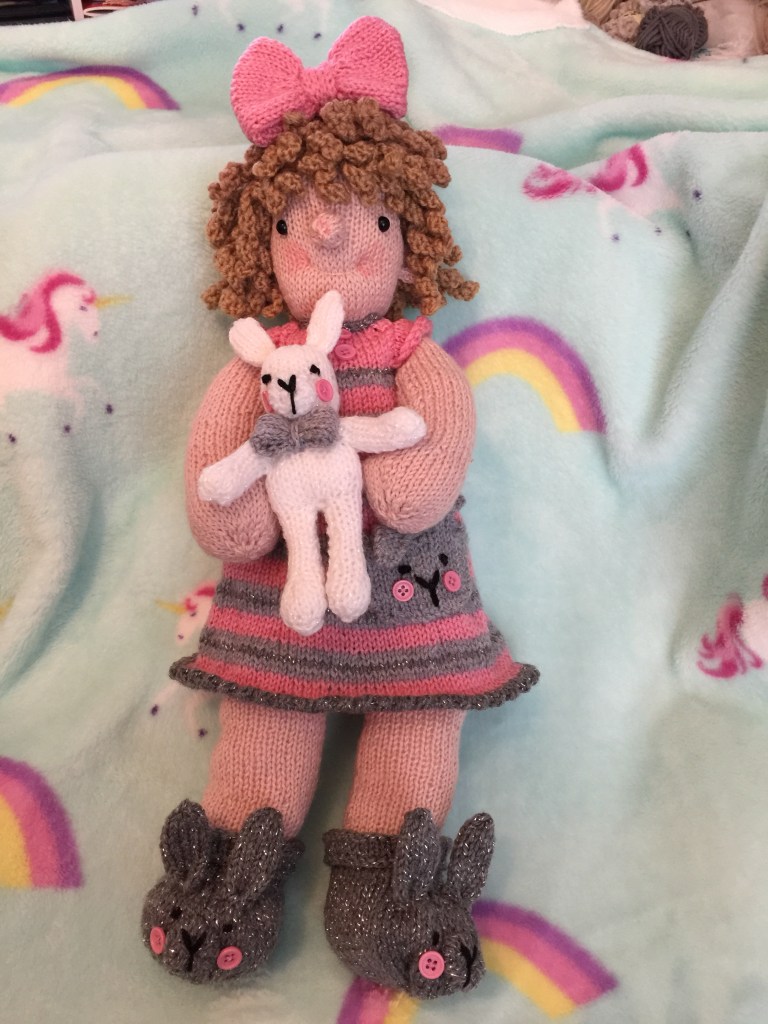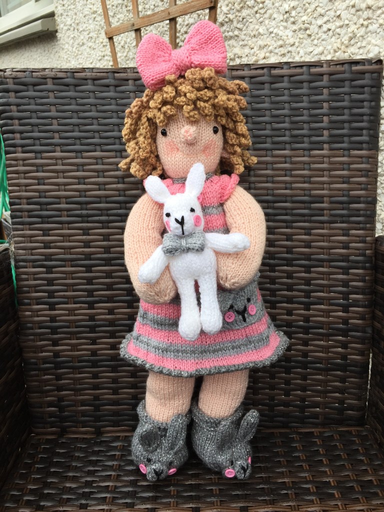 So we now have Loulou Belle and Bunny, all ready for bed in her first pattern. There will be more to come , more outfits and accessories, but for now her nightdress and slippers can be knitted as a day dress and boots if you exclude the bunny details.