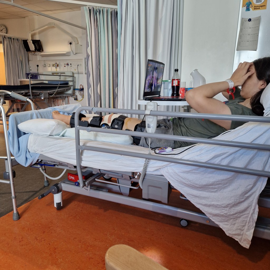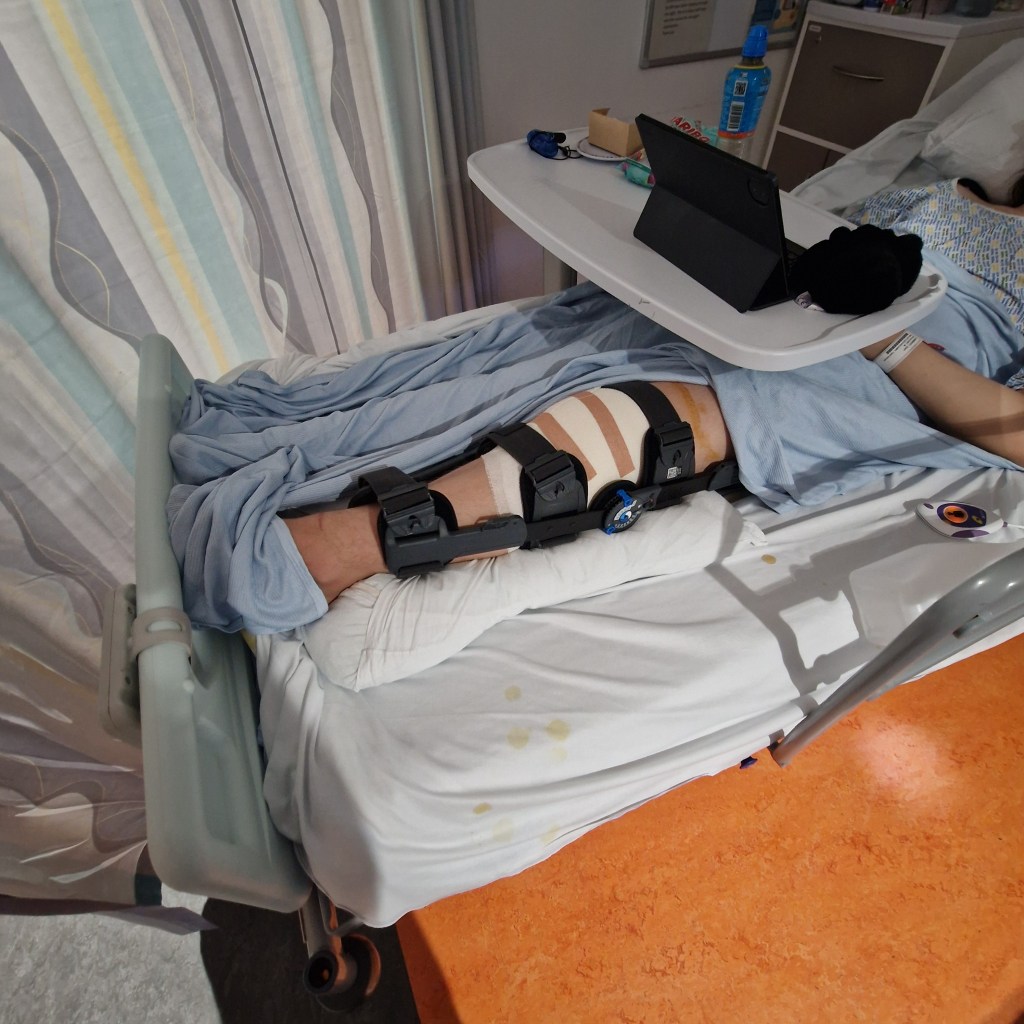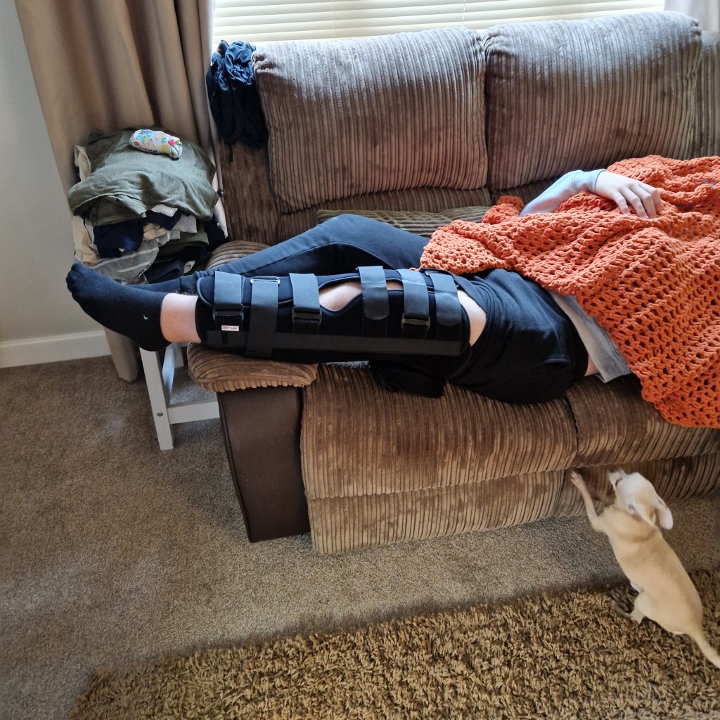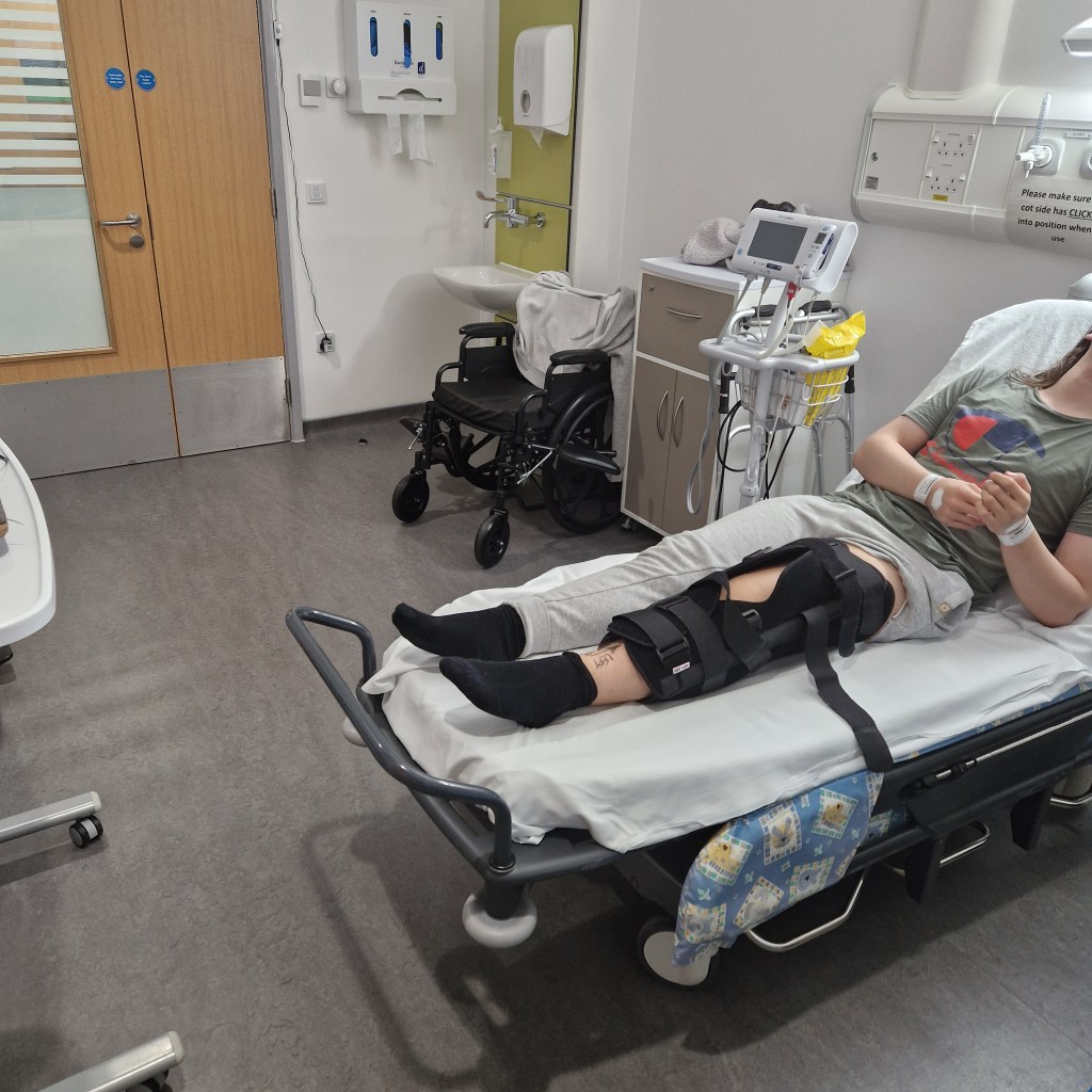 Zack’s leg is fully immobilised. Wrapped, braced, elevated, swollen.