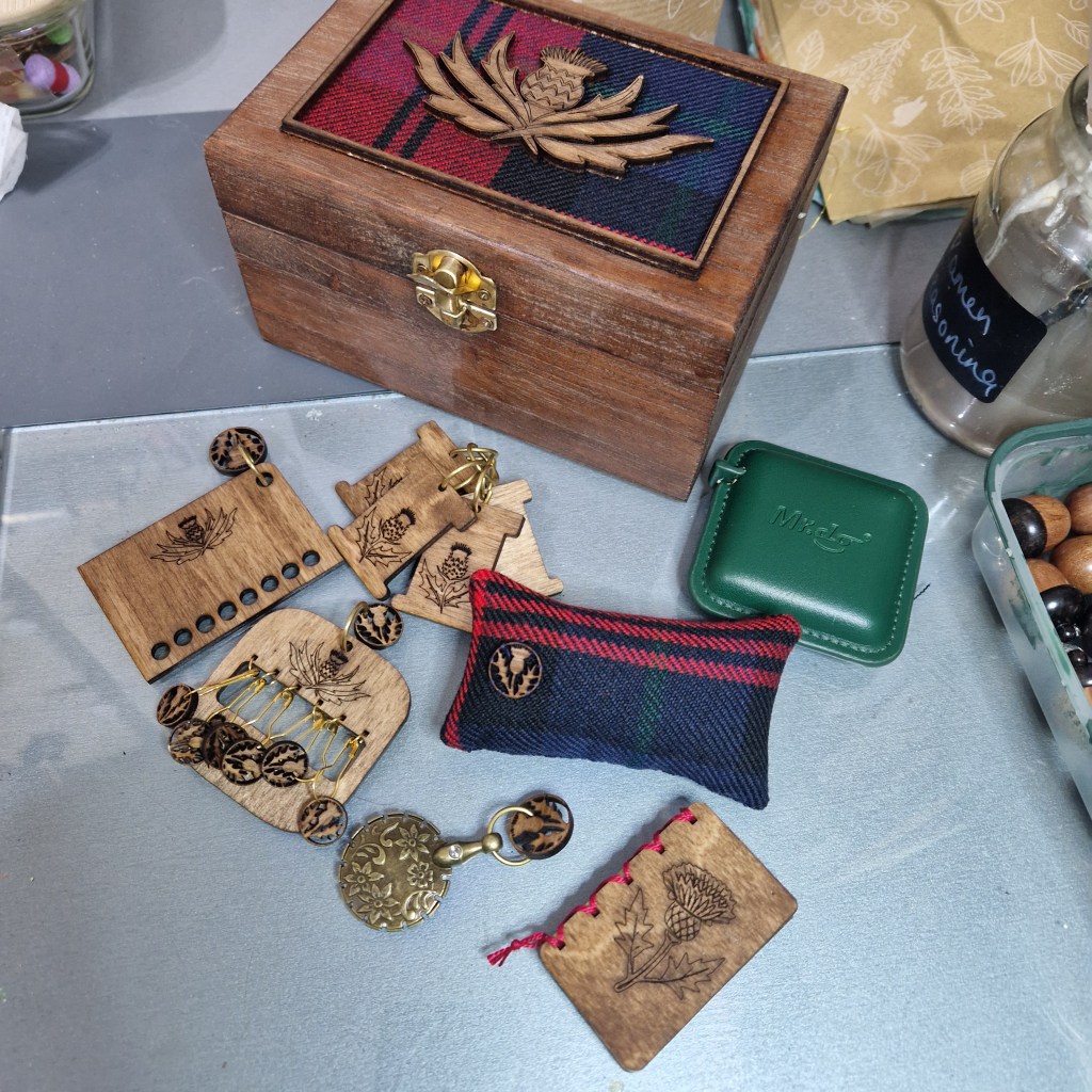 From thistle-etched needle minder boards to tiny tartan cushions and engraved key fobs, this batch has been a joy to make. Each piece carries a blend of rustic Highland vibe and modern craft finish. The trinket boxes have honestly stolen my heart — rich wood tones, soft tartan inlays, and that proud thistle rising on the lid. They feel like wee keepsakes you’d find tucked on a granny’s mantelpiece, passed down through generations.