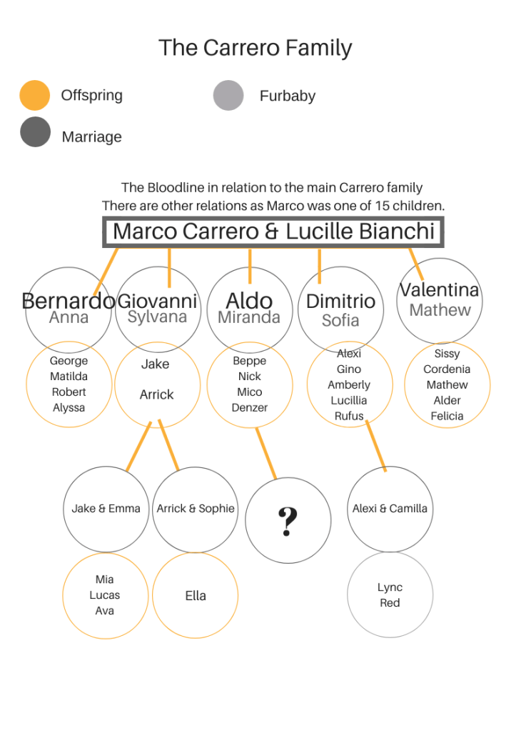 Carrero Family Tree Work in progress, will update as books are released – Be aware this page contains spoilers. Watch this space…… Carrero Offspring The Carrero Series